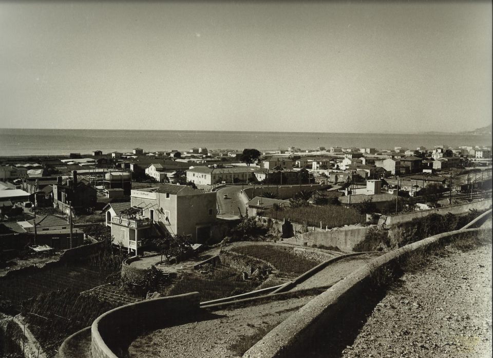 Non ho proprio resistito alla tentazione di pubblicare un'altra fotografia d'antan. Questa proviene, una volta di più, dal munito archivio di Andrea Niloni di Ventimiglia [(IM), Liguria di ponente]. Raffigura, con epicentro il cavalcavia sulla ferrovia all'epoca appena costruito, la zona di Nervia della città di confine a inizio anni '50. Ripresa da una delle prime curve della strada, che era ancora sterrata, della collina di Collasgarba, segnata dall'ultima guerra.