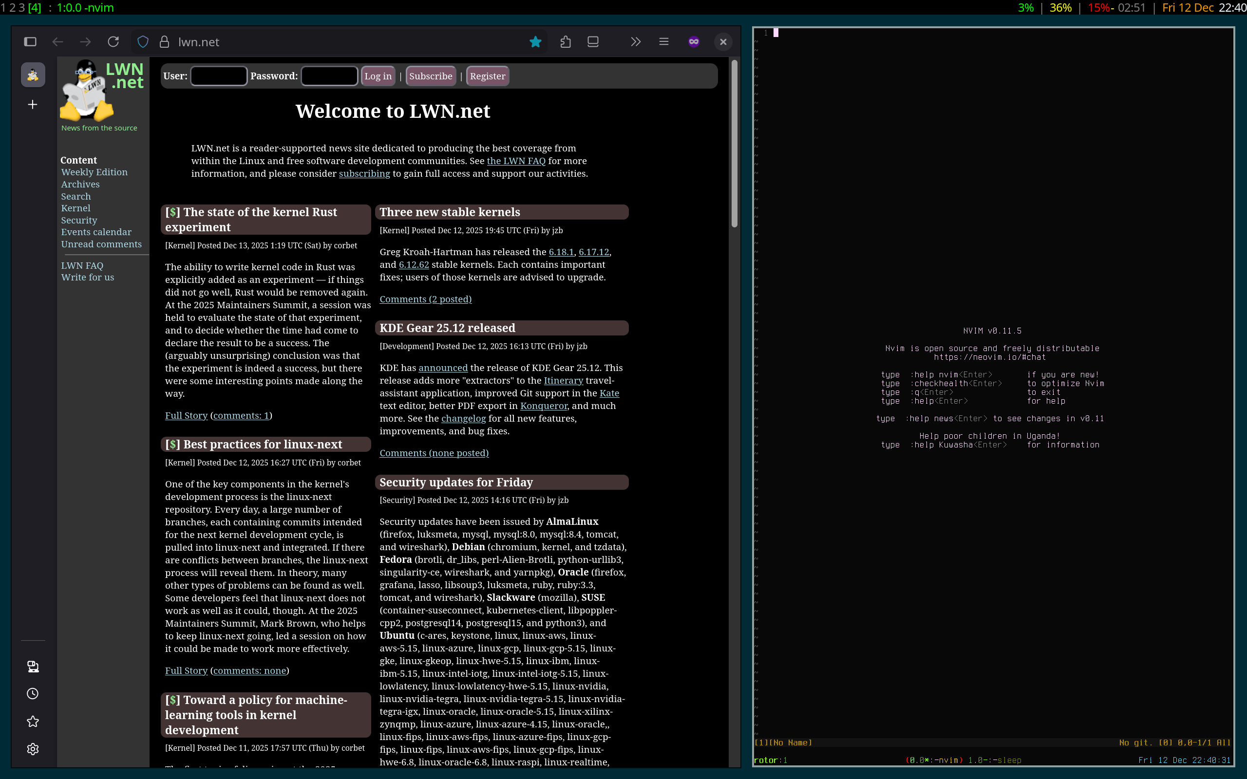 But in river, things feel more responsive. foot responds instantly and scrolls on demand. Firefox tab management also feels faster. mpv also feels faster. The lack of animation on workspace changing is also helpful in the subjective feel.