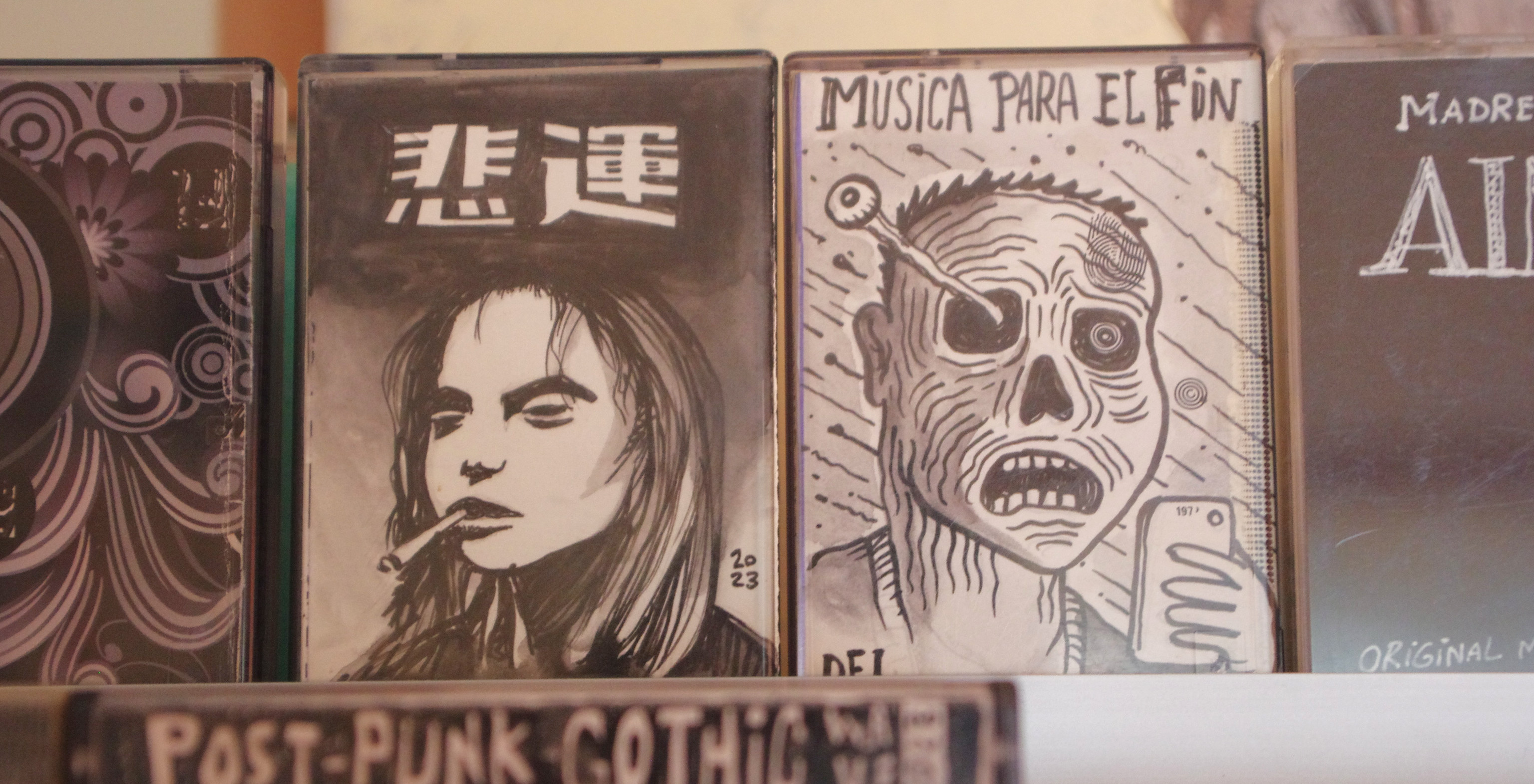 La música es un misterio, desconozco los títulos de las canciones, pero todas son rigurosamente seleccionadas de una lista de Youtube de genero oscuro post punk gothic alemán de los años 80 con trozos de música ambiente de pelis de John Carpenter, todo mal grabado y con ruidos utilizando un cable “line in” y en la peor radiocassette que tengo en casa. Una Anitech de doble pletina muy trallada que me costó 15€ y que a pesar de los años resiste y se escucha realmente bien.