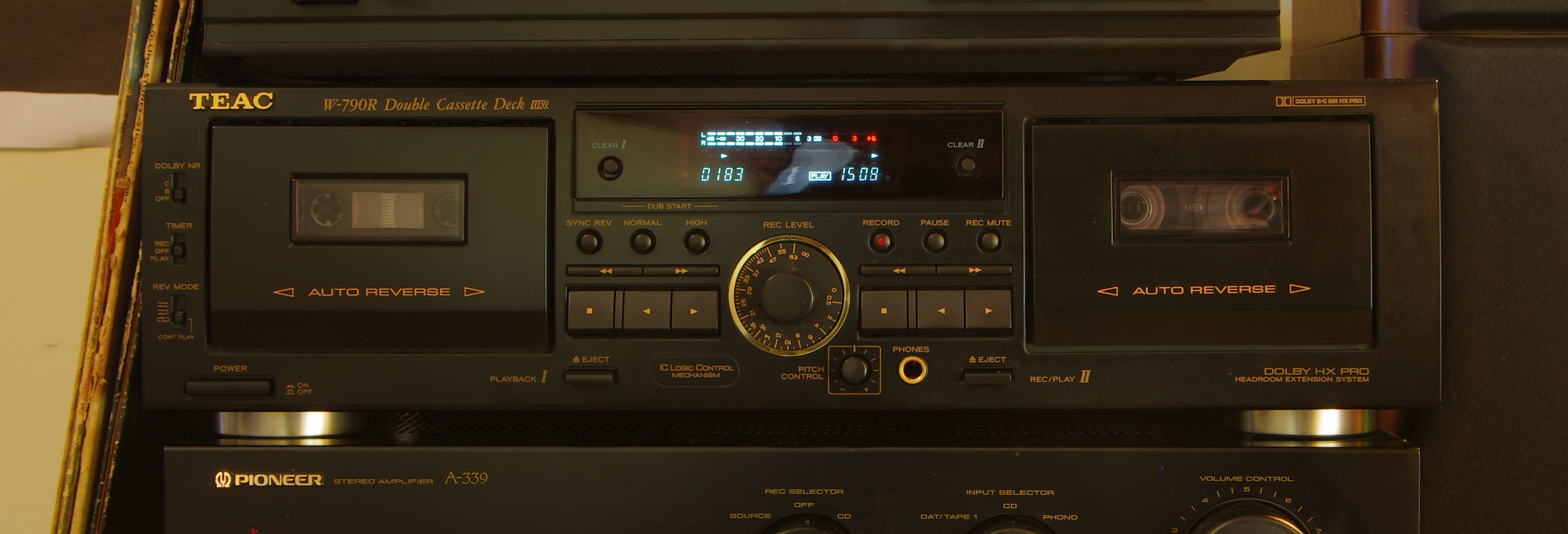 Aprovechando componentes de otras cadenas de música monté mi propio equipo; Amplificador Pioneer A-339 de mi suegro, este Teac W-790R de cassettes y un plato de vinilos Aiwa PX-E80. Todo conectado a 4 altavoces de un par de equipos Aiwa, más que suficiente para mi pequeño estudio ¡Le falta un equalizador y mando a distancia para ser perfecto!